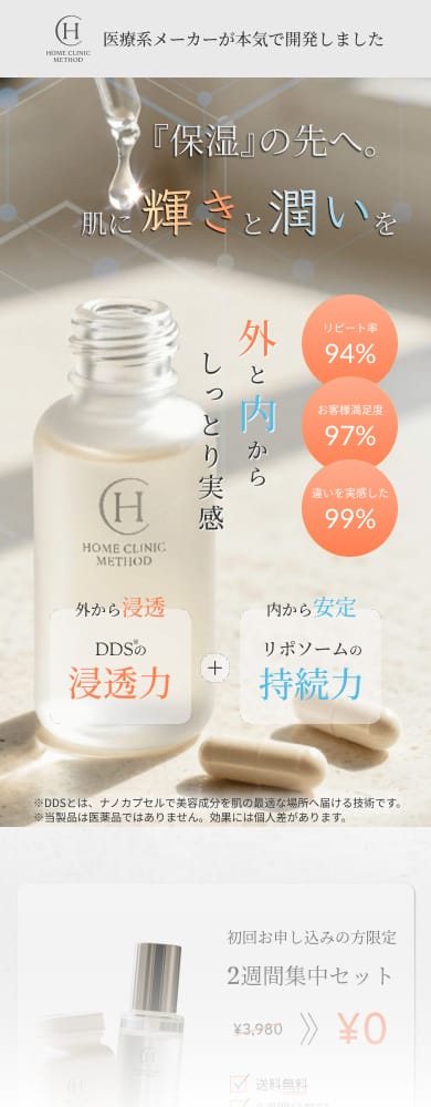 本サイト「Home Clinic Method」は、美容系商品の無料トライアル契約の獲得を目的としたランディングページです。キャッチコピー「『保湿』の先へ、肌に輝きと潤いを」を軸に、ユーザーに“自宅でクリニックレベルのケアができる”という価値を伝え、行動喚起へとつなげる設計としています。